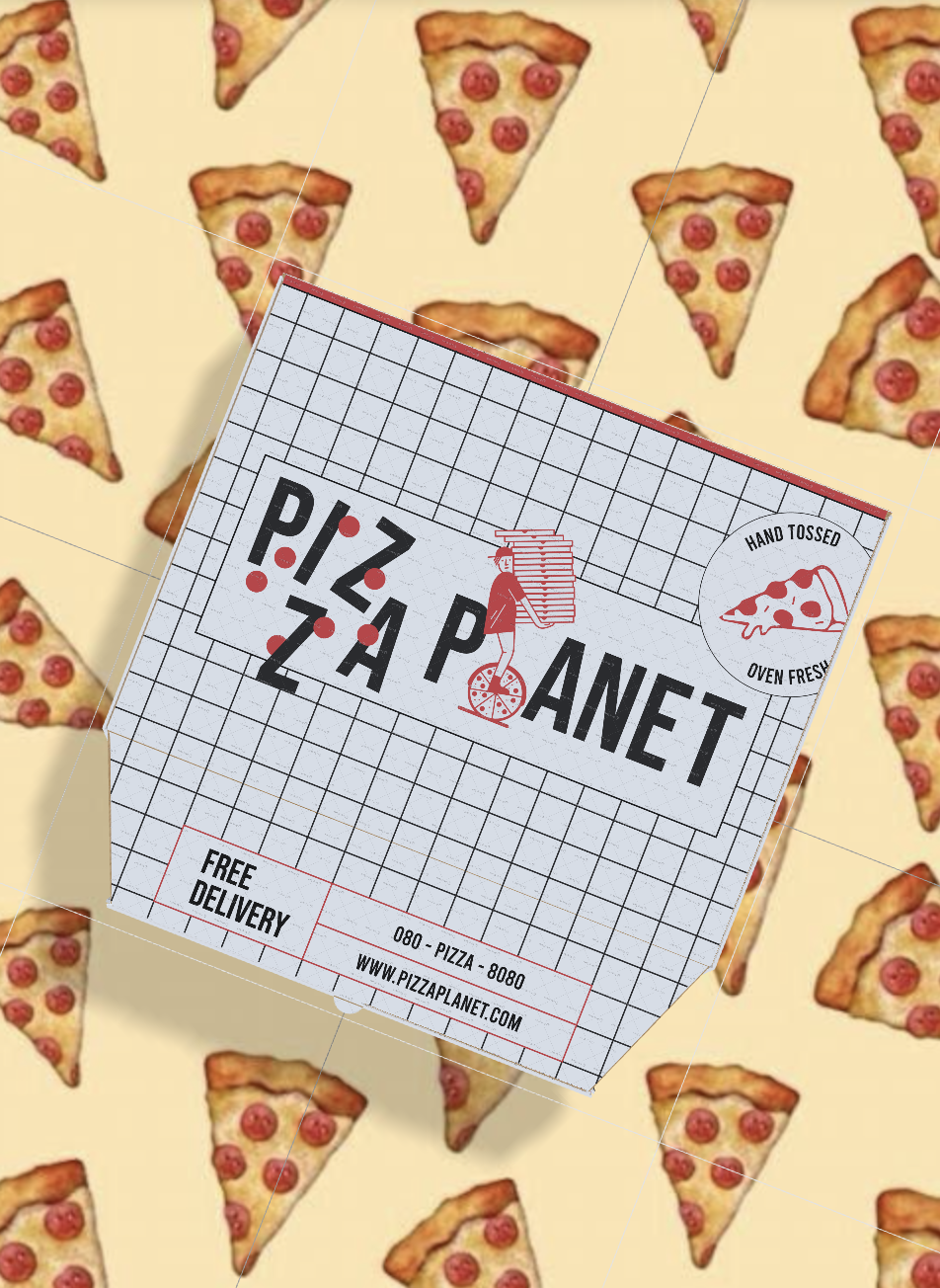 For Pizza Planet, I crafted a complete brand identity, including 3D mockups, from logo to packaging design. I also brainstormed slogans like "Slice to meet you" and created merch like tote bags and info documents.