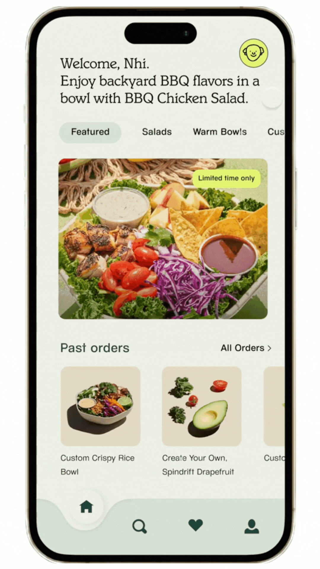 My redesigned Sweetgreen app features an intuitive bottom navigation bar for quick access to featured menu items and past orders. Enhanced Search and Favorites tabs include Scan to Pay and product visualization through photos, all while staying true to the brand's fonts and colors.